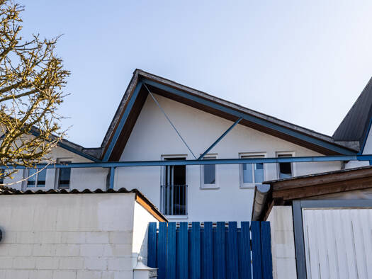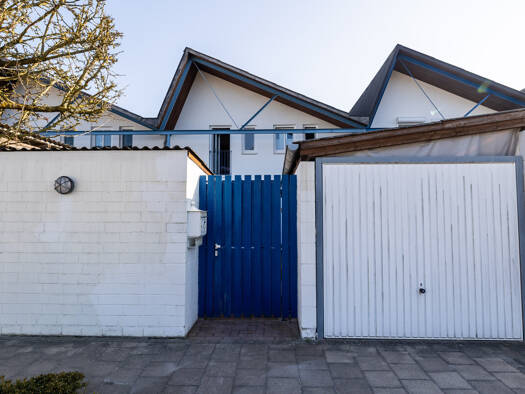Hübsches Reihenhaus (Massivhaus): 1 Außen-Stellplatz direkt vor dem Haus (im Preis enthalten). NEU in 2020 ! Gas-Brennwert-Therme. Weißer Außenputz mit attraktiver blauer Holzfassade im oberen Bereic...