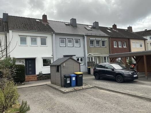 Dieses Reihenhaus wurde 1977 in Massivbauweise errichtet. Der Grundriss ist familiengerecht gestaltet. Im Erdgeschoss befinden sich ein Gäste-WC, Küche, Esszimmer und Wohnzimmer. An dieses schließt d...