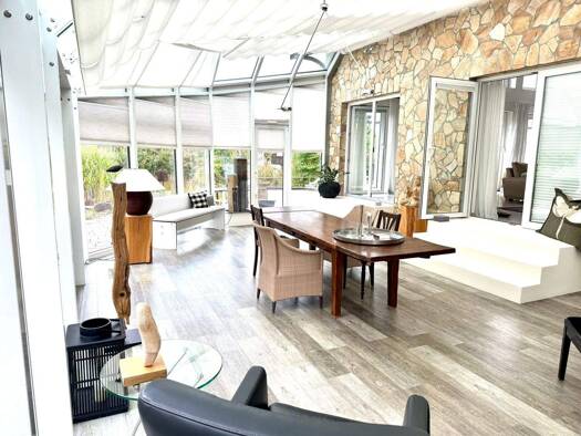 Diese außergewöhnliche Villa vereint zeitlose Eleganz mit modernem Wohnkomfort. Das Anwesen ist in zwei vollständig voneinander unabhängige Wohnflügel gegliedert und bietet dadurch vielseitige Nutzun...
