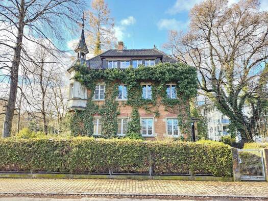 Denkmalgeschützte Villa, Bj. 1908, Historismus/Jugendstil, umrahmt von altem Baumbestand und umlaufender Mauer mit zwei Gartentürmchen. 329 m² Wohnfläche, ca. 93 m² Nutzfläche. 1.056 m² Grundstück. M...