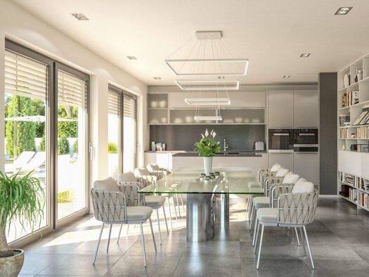 Treten Sie ein in die herrschaftliche Familien-Villa, und genießen Sie und Ihre ganze Familie ein einzigartiges Zuhause: Gleich am Windfang befindet sich das Gäste-WC und vom hellen Hausflur in der B...