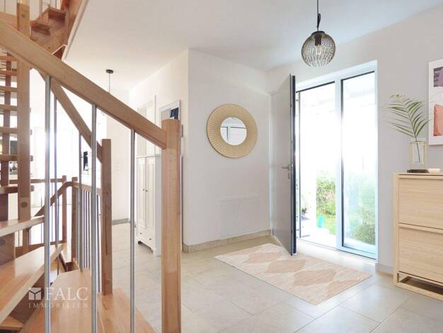 Beim Betreten des Hauses empfängt Sie ein einladender Eingangsbereich, der mit hellen Fliesen und einer modernen Treppe ausgestattet ist. Von hier aus gelangen Sie direkt in den großzügigen Wohn- und...