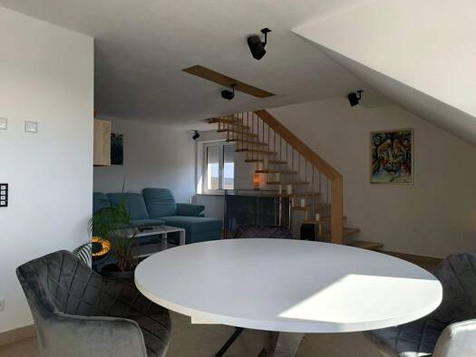 Objektbeschreibung Modernes Objekt im 2. und 3. OG über 2 Etagen auf neuestem Energiestand, sehr geschmackvoll mit elektrischen Annehmlichkeiten. Die Wohnfläche kann von 122qm auf 150qm erweitert wer...