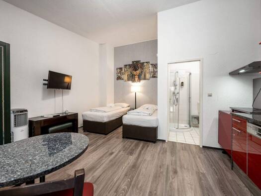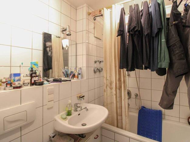 Eigentumswohnung mit folgender Aufteilung: • 2 Zimmer • offene Küche im Wohnzimmer • Balkon • Flur • kleines innenliegendes Bad mit Badewanne • Miteigentumsanteil: 75,21 / 10.000 am Grundstück Die Ei...