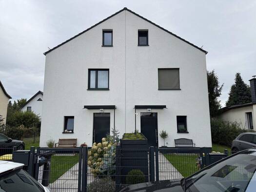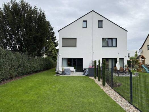 Das moderne, unterkellerte Doppelhaus mit Satteldach wurde im Jahr 2021 errichtet und befindet sich in einem sehr gepflegten und neuwertigen Zustand. Das Gebäude ist mittig in zwei Haushälften geteil...