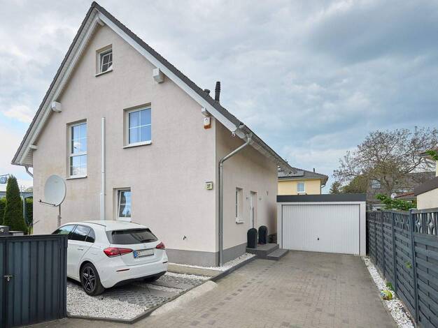 Auf zwei Ebenen vereint dieses Haus durchdachte Planung mit markantem Design. Die Fassade spielt mit Symmetrien und verleiht dem Baukörper eine besondere Präsenz, während der überdachte Eingang einen...