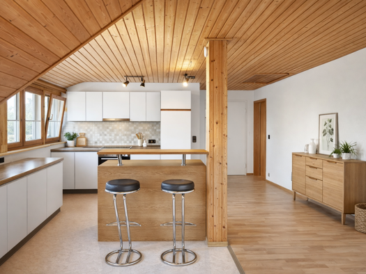 Haus: Die Küche bildet den Mittelpunkt des Wohnbereichs. Von hier gelangen Sie direkt in das gemütliche Wohnzimmer mit Kachelofen und Kunst. Vom Wohnzimmer aus erschließt sich ein separates Zimmer mi...