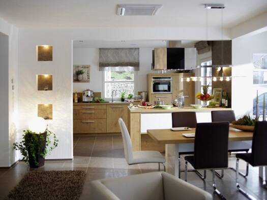 In diesem Einfamilienhaus werden stilprägende Akzente durch die 46 m² große Kombination aus Kochen, Essen und Wohnen gesetzt. Außergewöhnlich ist die zentrale Lage der geradeläufigen Treppe, unter de...