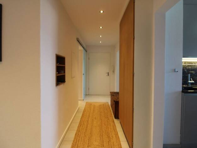 Beim Betreten der Wohnung gelangt man in einen weitläufigen Flur, der zentral zu allen Räumen führt. Hier gibt es ausreichend Platz für eine stilvolle Garderobe und zusätzliche Stauraummöglichkeiten ...