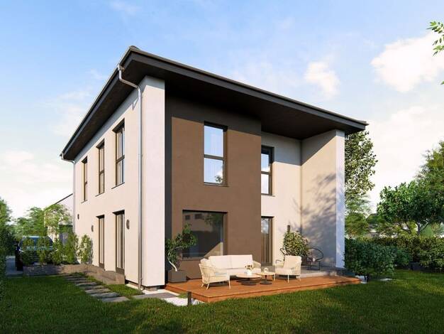 Schlichte Eleganz gepaart mit einem durchdachten Raumkonzept - das zeichnet das Einfamilienhaus Design 9.2 aus. Die geradlinige Architektur wird noch unterstrichen durch die zweifarbige Fassadengesta...