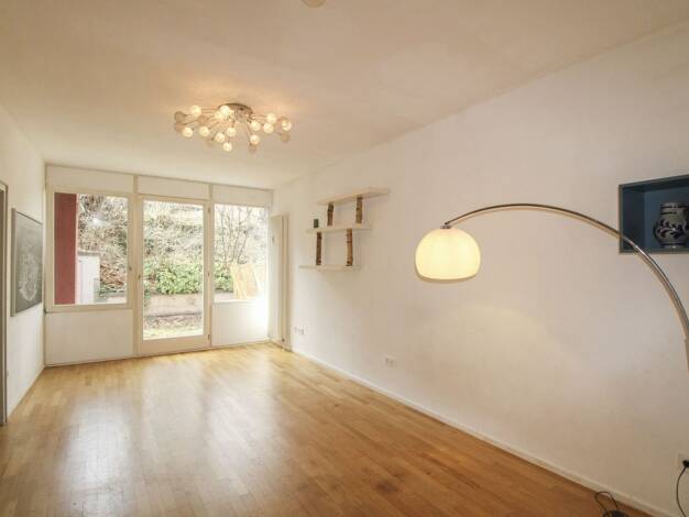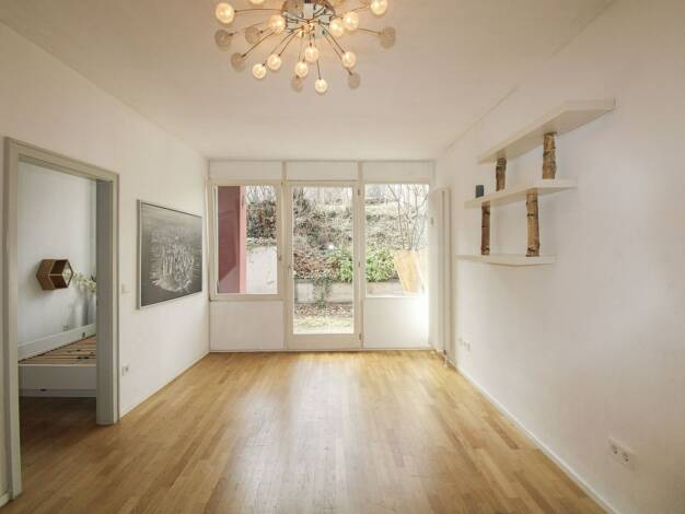 Die 1-Zimmer-Erdgeschoss-Wohnung mit Terrasse und kleinem Garten ist nach Süden und Osten ausgerichtet. Die Küchenzeile befindet sich im Eingangsbereich. Gegenüber das innen liegende Badezimmer mit D...