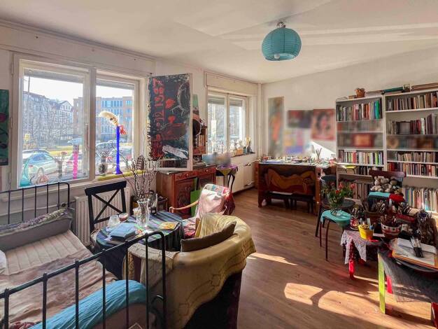 Die Wohnung befindet sich in der 2. Etage (ohne Aufzug) eines um die Jahrhundertwende erbauten Mehrfamilienhauses, das durch seine Stuckelemente und farbig verglasten Fenster im Hausflur und Treppena...