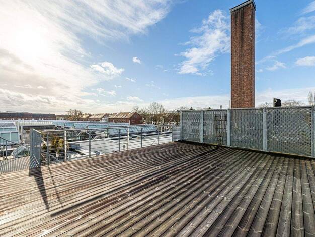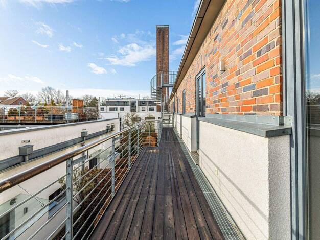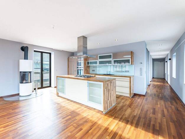 Objektbeschreibung Diese Penthouse-Wohnung im Dachgeschoss bietet ein außergewöhnlich großzügiges Wohngefühl mit einer beeindruckenden Deckenhöhe von bis zu 4,20 m, sichtbaren Holzbalken und großen D...