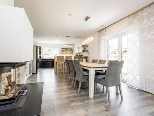 Beim Eintreten durch den Windfang spürt man sofort die einladende Atmosphäre des Hauses. Highlights sind die moderne Einbauküche, die harmonisch in den Essbereich übergeht und in den Wohnbereich münd...