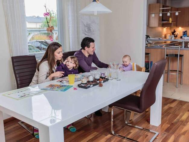 Die Stadtvilla 9 nutzt ihre 107 m² perfekt - mit einem Grundriss, der modernes Familienleben leicht macht. Im Erdgeschoss öffnet sich der helle Wohnbereich mit Küche und Essplatz zu einem Raum, in de...