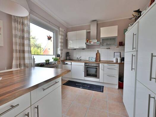 Wohnfläche: 127,17m² Über eine dreistufige Außentreppe mit Podest betreten Sie die einladende Eingangsdiele dieses gepflegten Wohnhauses. Auf der linken Seite befindet sich die großzügige Küche, ausg...