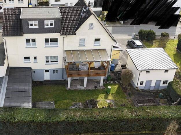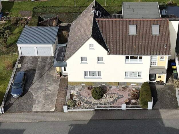 Zwei sehr helle Häuser auf einem Grundstück. Kleiner, auch für Kinder ausreichender Garten auf der Südseite. Garage für zwei Autos. Freundliche und hilfsbereite Nachbarn. Großes Vordach vor der Garag...