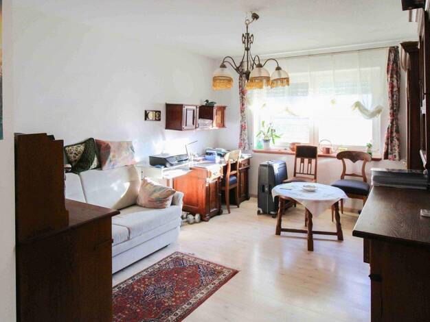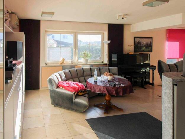 Die Erdgeschoss Wohnung befindet sich in einem 2 Parteien Haus, in einem ruhigen Ortsrand in grüner Umgebung. Die Terrasse mit angrenzendem Garten ist vom Wohnzimmer aus begehbar. Das geflieste Tages...