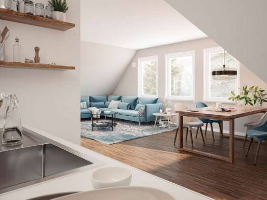 Die kubische Form ist der Klassiker im Stadthausdesign und prägt auch das Aussehen unseres Stadthaus Flair 124. Im Inneren setzt sich der urbane Stil fort: der großzügige Wohn- und Essbereich erstrec...