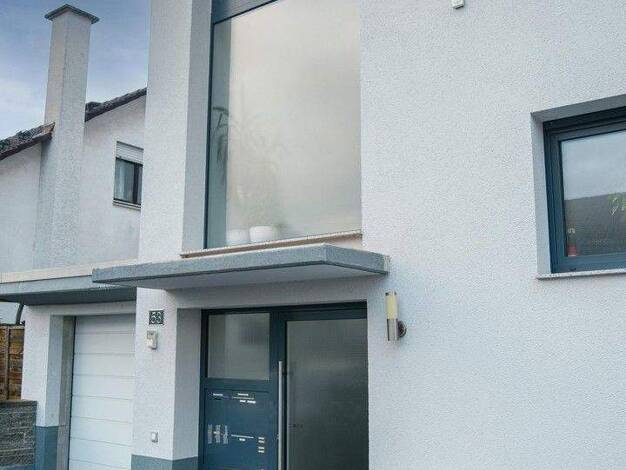 Nicht alltägliches, modernes Zweifamilienhaus. Das Haus verfügt über zwei identisch große Wohnungen mit einer Terrasse im Erdgeschoss und zwei Balkonen im Obergeschoss. Das Haus ist komplett unterkel...