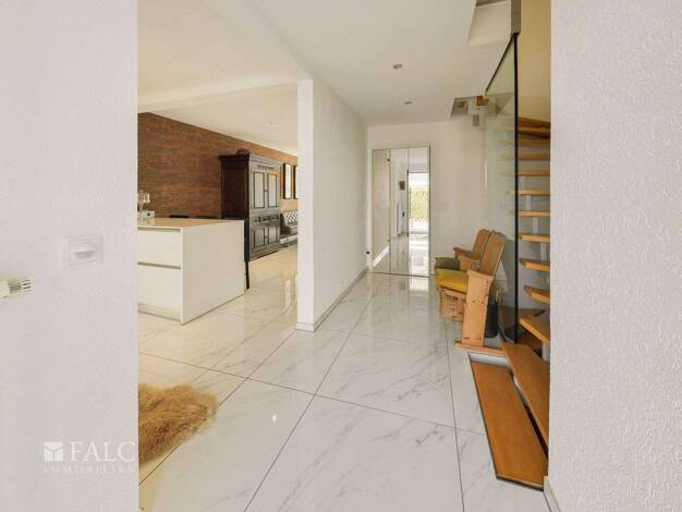 Das massiv errichtete Haus aus dem Jahr 1992 verfügt über eine Wohnfläche von etwa 172?m² und steht auf einem 714?m² großen Grundstück. Nach dem Eintreten gelangt man in einen zentralen Eingangsberei...