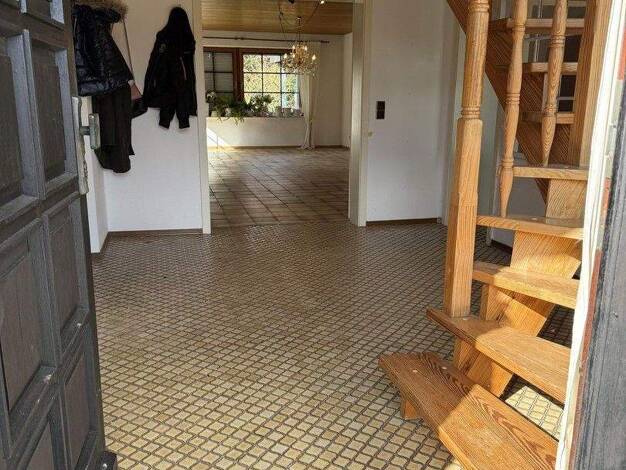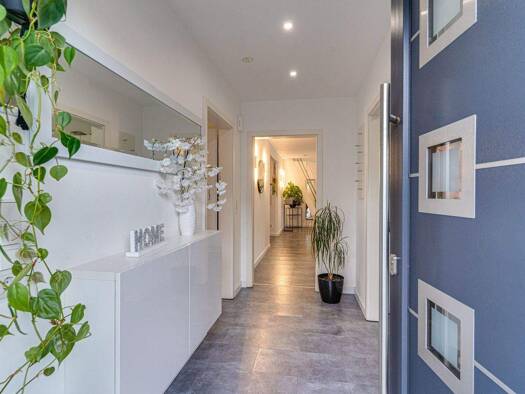 Willkommen in diesem einzigartigen Zuhause, das durch seinen geschichtlichen Charme und moderne Annehmlichkeiten besticht. Der einladende Haupteingang führt Sie in eine großzügige Diele, von der aus ...