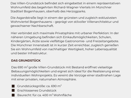 Das Villen-Grundstück befindet sich eingebettet in einem repräsentativen Wohnumfeld des begehrten Richard-Wagner-Viertels im Münchner Stadtteil Bogenhausen, oberhalb des Herzogparks. Die Asgardstraße...