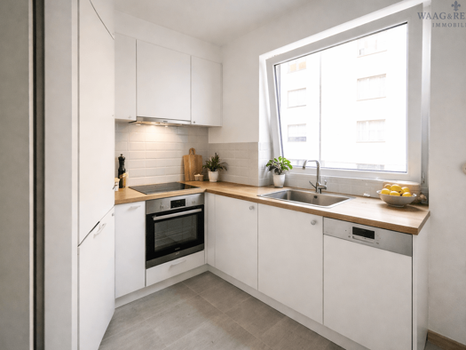 Das moderne, sonnige 1,5-Zi.- Premium-Apartment mit Balkon ist hochwertig neu ausgebaut und entspricht Neubauausführung. Besondere Ausstattung mit Klimaanlage, Fußbodenheizung, neue Einbauküche, 3-fa...