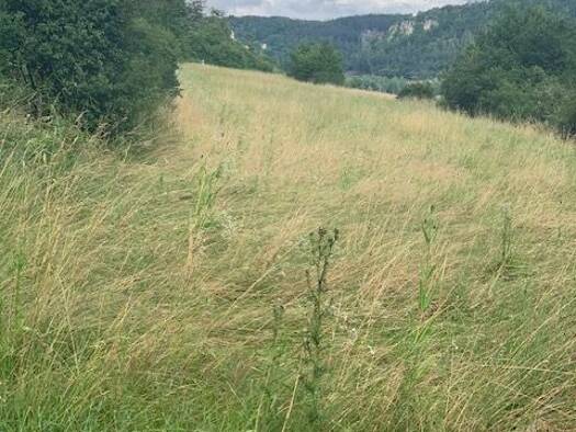 Das Grundstück hat leichtes Gefälle, siehe Fotos, und es liegt drüberhalb der Altmühl, oben am Altmühlweg, zirka 200 Meter vom Fluß entfernt. Kein Baugrund bislang. Landwirtschaftlich nutzbar.
