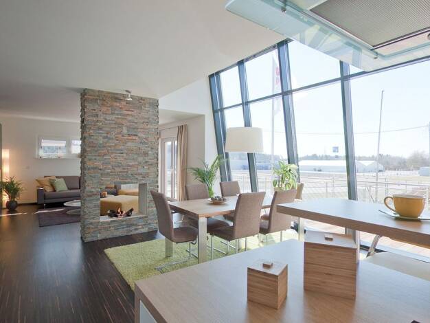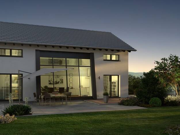Modern, lichtdurchflutet und einfach repräsentativ: Das Einfamilienhaus Trendline S 2 begeistert mit einer beeindruckenden Glasfront über zwei Etagen und einer offenen Raumgestaltung, die Wohnen, Ess...