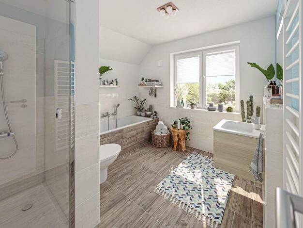 Das Flair 113 bietet alles, was ein Massivhaus gemütlich macht. Im Erdgeschoss betreten Sie ein geräumiges Wohn- und Esszimmer, eine Küche mit genügend Freiraum, ein Gäste-WC und einen Hauswirtschaft...