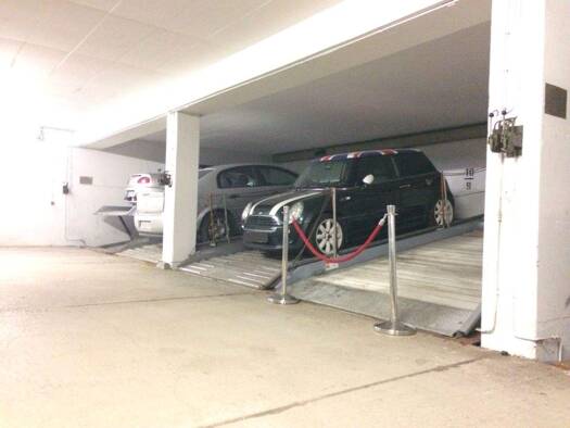Duplex-Parker Nummer 18 in einer Tiefgarage, Baujahr 1982. Die Duplex-Garagen Nummer 18 und Nummer 19 nutzen gemeinsam ein mechanisches Parksystem mit Doppelbühne, das jährlich gewartet wird. Die Ges...