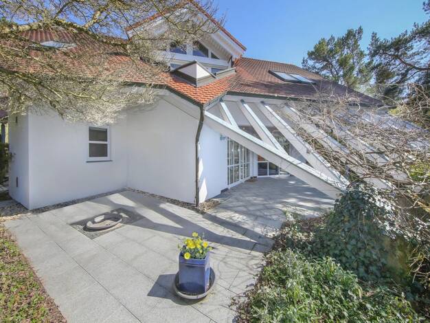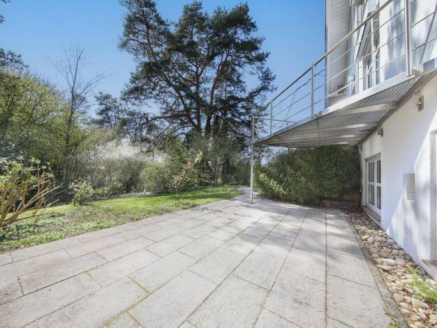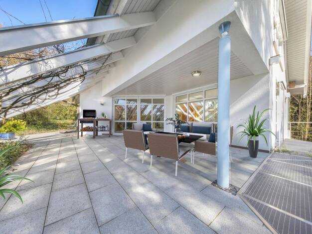 Dieses lichtdurchflutete und vollständig unterkellerte Architektenhaus mit wenigen, besonders großzügig geschnittenen Räumen und zeitloser Architektur in unverbaubarer Südlage direkt am Landschaftssc...