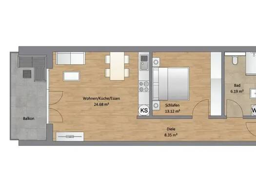 Im Obergeschoss befindet sich Wohnung Nummer 3 mit einer Wohnfläche von 49 Quadratmetern. Sie besteht aus einem Flur, Garderobe, Bad/WC, Abstellraum, Küche, Wohn-/Schlafzimmer und einer Loggia. Das B...