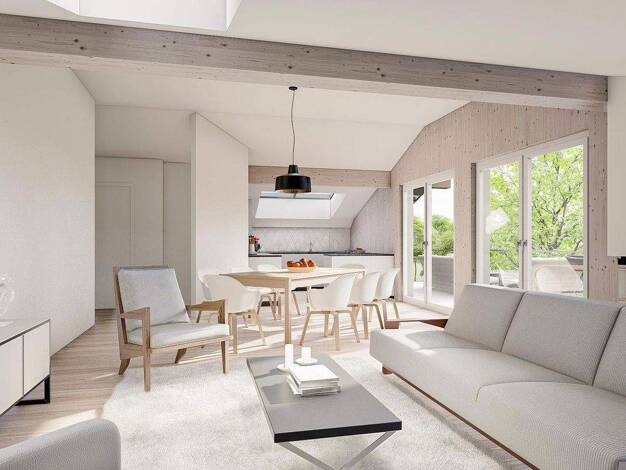 Diese traumhafte 4 Dachterrassenwohnung befindet sich im 2. Stock (mit Lift) in einem kleinen Mehrparteienhaus mit 5 Wohneinheiten aus Massivholz bei Käferheim/Wals Salzburg.