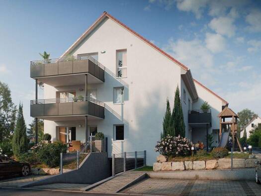Auf dem nach Süden ausgerichteten Grundstück entsteht ein Haus mit 7 Wohnungen und 11 Stellplätzen im förderfähigen KfW-40 Standard. Im Erd- und Dachschoss befinden sich je zwei Wohnungen, im Oberges...