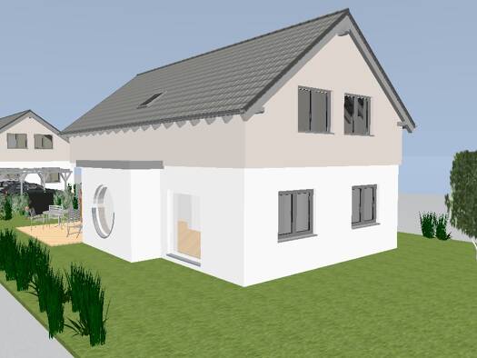 Freistehendes Haus in 1 1/2-geschossiger Massivbauweise. Hausgröße 7.00 x 12.00 Meter. Außenwände 36,5 cm mit wärmegedämmtem Ziegelmauerwerk.
