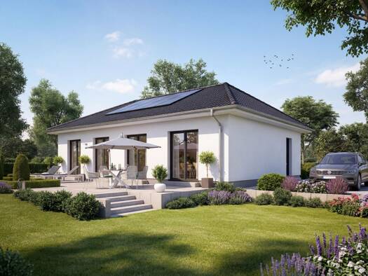 Der baugenehmigungsfähige Bungalow erfüllt den Effizienzhaus 55 Standard (EH-55) nach dem Gebäudeenergiegesetz (GEG vormals EnEV) und hat aus statischen Gründen einen hochfesten Sicherheits-Stahlrahm...
