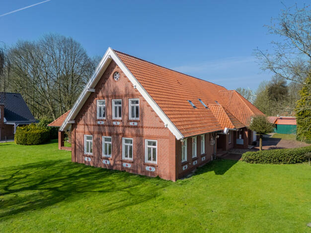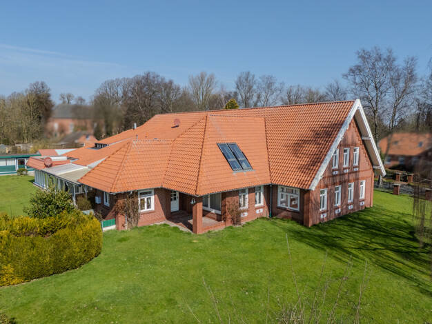 Das im Jahr 2000 massiv aus rotem Klinker gestaltet und mit Tondachpfannen errichtete Wohnhaus mit Einliegerwohnung ist ein Dreigiebelhaus, zu den Seiten mit Krüppelwalm. Rundum mit Doppelglas-Thermo...