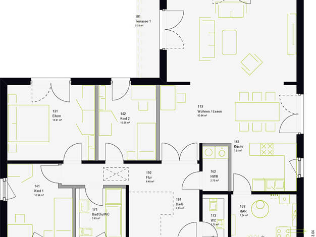 Das Flair 134 ist ein Haus für die ganze Familie mit genügend Freiraum für jeden. Die offen gestaltete Diele führt Sie direkt ins großzügig angelegte, sonnendurchflutete Wohnzimmer mit gemütlicher Es...
