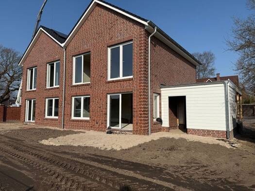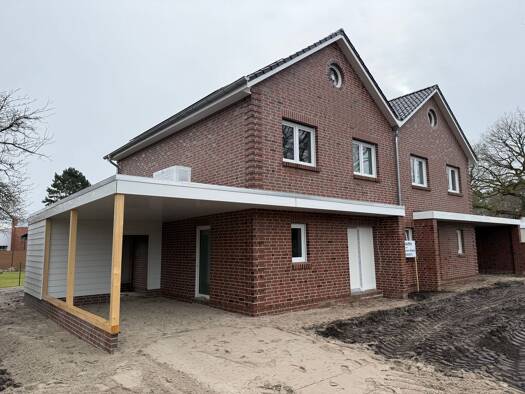 Neubau einer modernen Zwillingshaushälfte.. Erdgeschoß: Wohnen/Essen/Kochen, Schlafen, Gäste-WC, Hauswirtschafts- raum, Diele, Terrasse. Obergeschoß: 3 Zimmer, Bad, Flur. Carport bzw. Garage gegen Au...