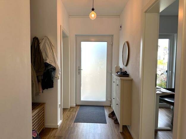 Erdgeschoss: Beim Betreten des Hauses empfängt Sie ein einladender, heller Flur mit praktischem Garderobenbereich. Zur rechten Seite befindet sich der Hauswirtschaftsraum mit großzügigem Stauraum für...
