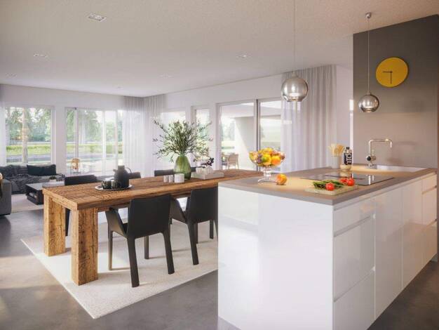 Wer sich ein zeitlos schönes Eigenheim mit einem großzügigen Platzangebot wünscht, der sollte bei diesem Entwurf etwas genauer hinschauen. Von außen überzeugt das Fertighaus mit seiner klaren Geometr...