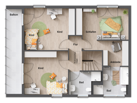 Hier finden Sie eine Projektierungsidee, was Sie auf diesem schönen Bauplatz realisieren können - z.B. ein Haus mit vier Kinderzimmern. +++ Inklusive unserem Keller, der Ihnen noch mehr Möglichkeiten...