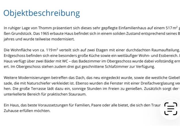 Objektbeschreibung In ruhiger Lage von Thomm präsentiert sich dieses sehr gepflegte Einfamilienhaus auf einem 517 m' groBen Grundstück. Das 1965 erbaute Haus befindet sich in einem sehr guten Zustand...