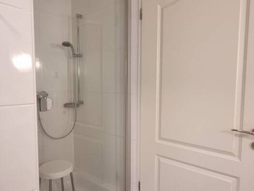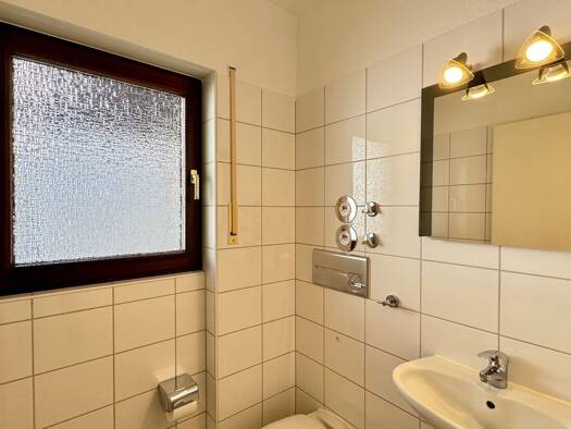 Das Entree ist eine angemessen großzügige Diele. Dem Eingang gegenüber liegt das hell und ansprechend weiß geflieste Tages-licht-Bad, ausgestattet mit einer Dusche, einer Badewanne, einem Doppelwasch...