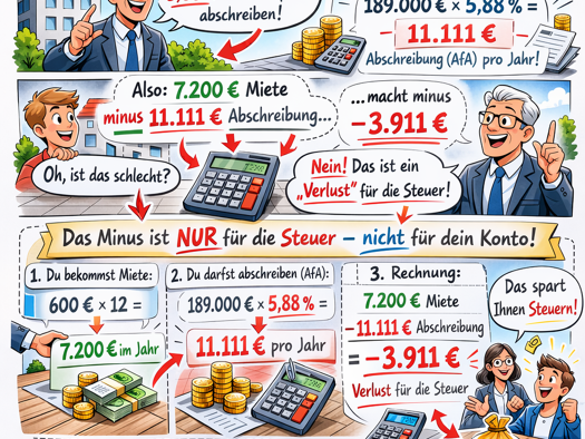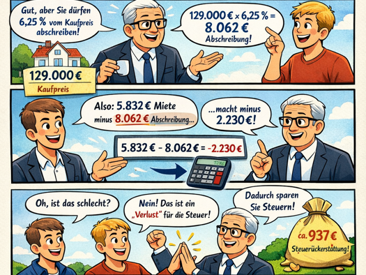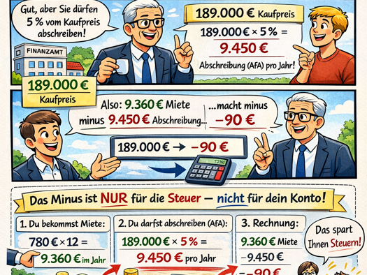 Bei einem Kaufpreis von 249.000 € ergibt sich bei einer möglichen Abschreibung (AfA) von bis zu 5 % jährlich ein steuerlicher Vorteil von 12.450 € pro Jahr. Dies kann die Steuerlast spürbar reduziere...
