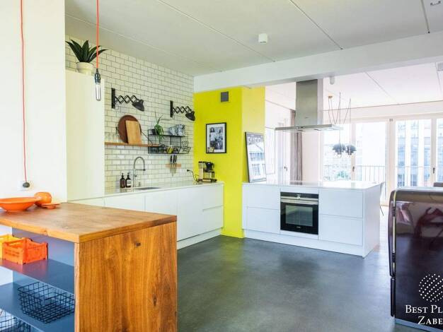 Das Penthouse verbindet klare Architektur mit einer Lage am Schnittpunkt von Mitte und Kreuzberg. Sichtbeton, freigelegte Ziegel und Stahl-Glas-Elemente prägen den offenen Grundriss und geben der Woh...