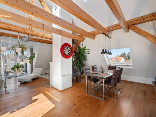 Tolle Wohnung mit viel Wohnflair über 2 Ebenen im Dachgeschosses eines kleinen feinen Mehrfamilienhauses (6 Partien). Die Wohnung hat ca. 116 m² Wohnfläche verteilt auf 2 Ebenen. Wohnen/Essen mit Kam...
