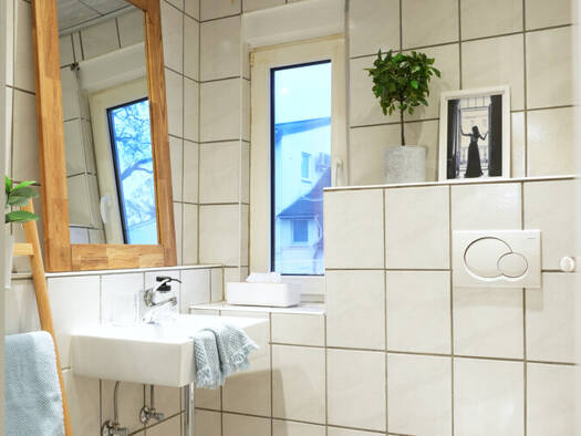 Eine Maisonette- Wohnung, mit 2 Schlafräumen, gemütlichem Wohn-/Essbereich, einer Terrasse mit angrenzendem Garten, Stauraum im Keller und auf dem Dachboden, zwei Stellplätze. Im Grünen soll sie sein...